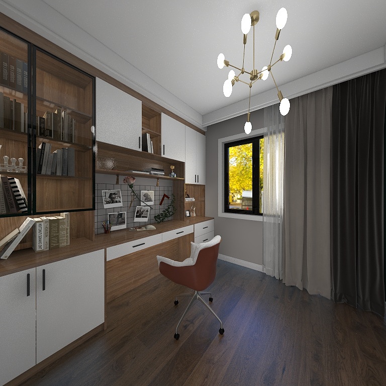 书柜、写字桌定制化设计,搭配木质地板,使书房多了几分硬朗气息。