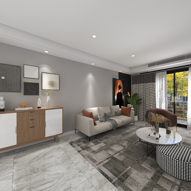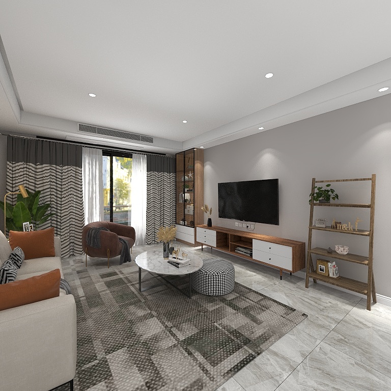 客厅以白色与灰色为基础色调,呈现出干净明快的北欧基调,局部搭配绿植点缀,室内清新爽朗。