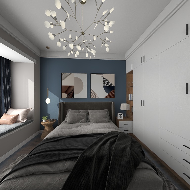 室内没有太多复杂的设计和华丽的色彩,蓝色背景与灰色床品结合,室内显得十分静谧。