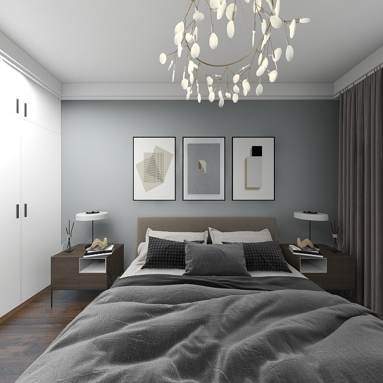 次卧沿用主卧的灰色床品设计,背景墙以灰色为主,搭配白色衣柜空间质感十足。
