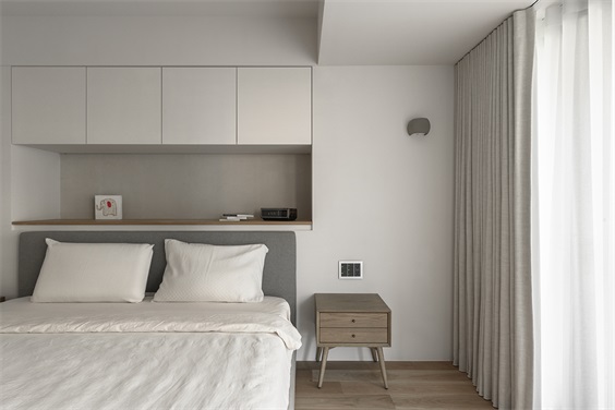侧卧以白色为基调,床头收纳能力强,不仅有功能性,还有拓宽视觉的效果。