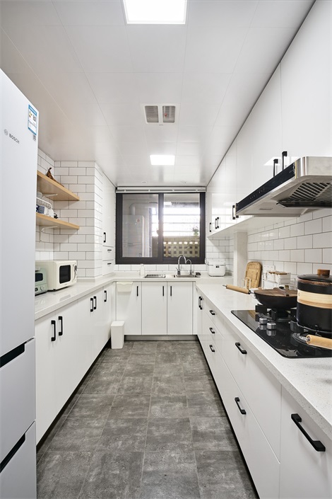 厨房以白色为基调,白色橱柜迎合了室内的主色调,使空间看上去明亮洁净。