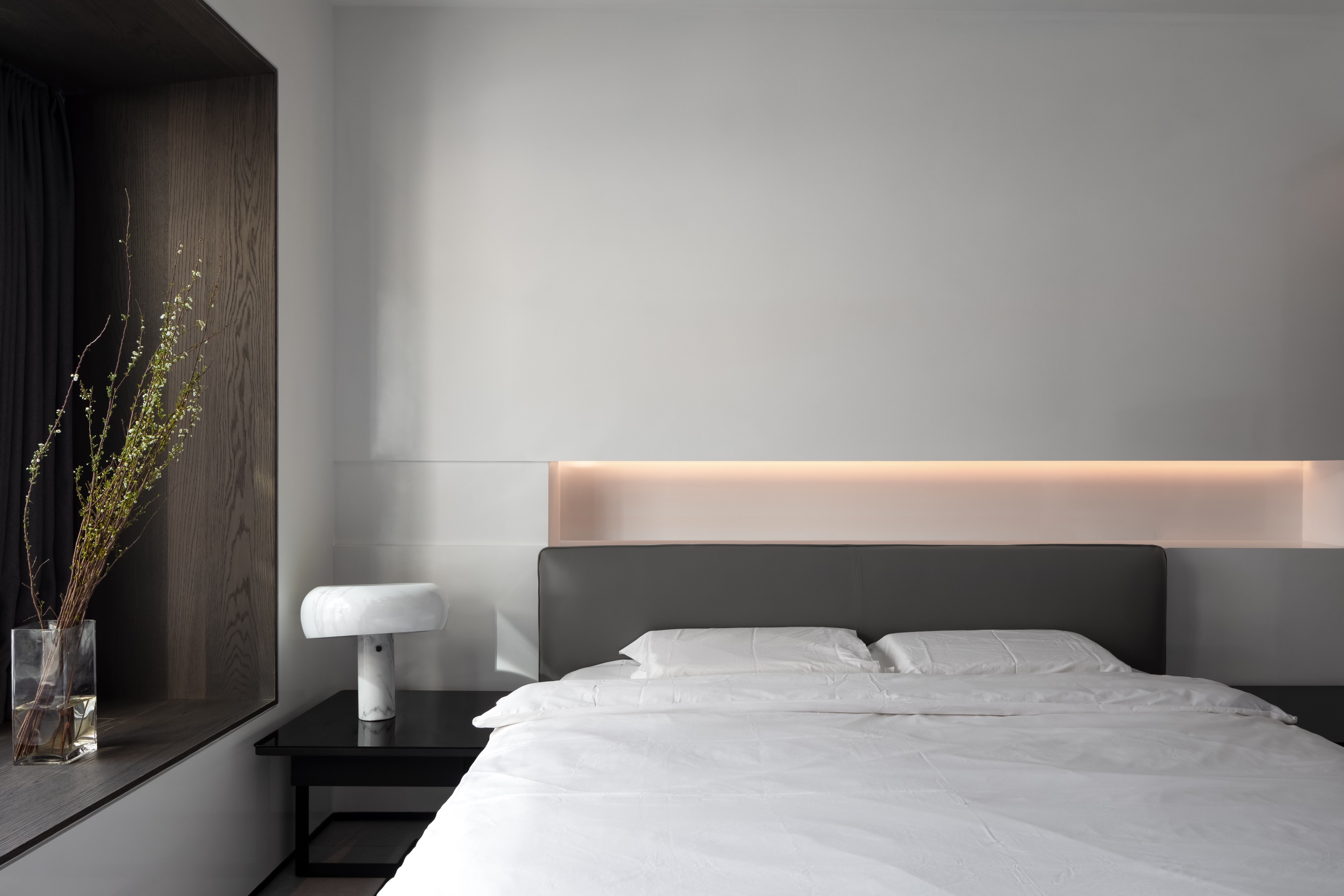 主卧背景墙层次感强,提升了空间质感,灰色床头成为点缀色彩,营造出素净感。