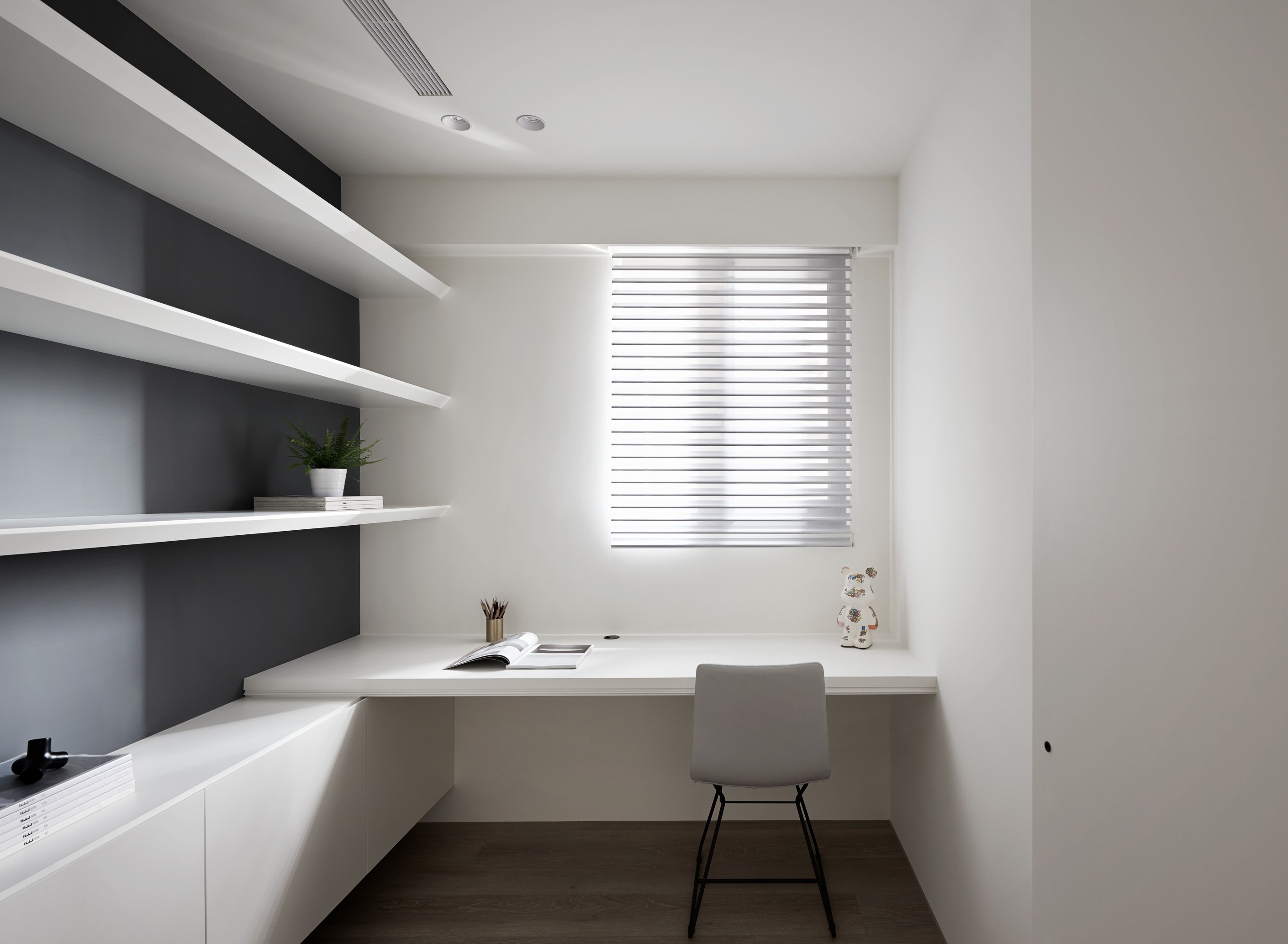 书房洁净感强,全屋以白色为主题,搭配搁台划分出不同的收纳区域,视觉上层次分明。