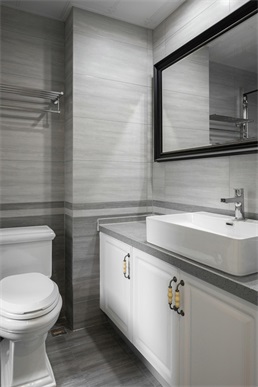 卫生间结构紧凑,背景墙采用大理石铺贴并在腰线处做了渐变设计,提升了空间的品质感。