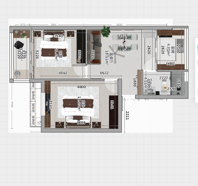 客厅与餐厅横向相连,在同一面采光处,室内通风效果较好,动静分区明显。