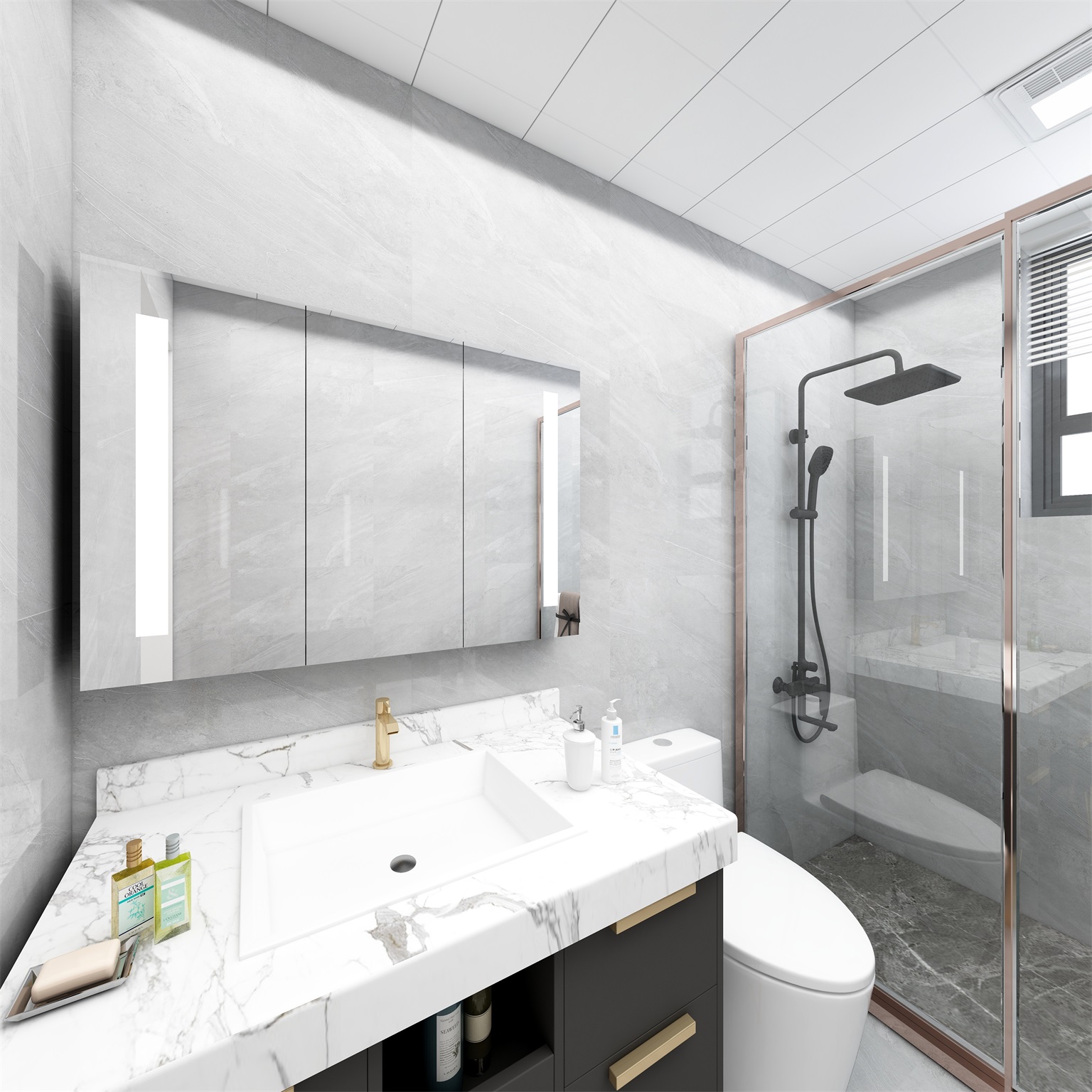 卫生间配色简单,整体以白色为主,局部采用了干湿分离设计,整体有序而干净。