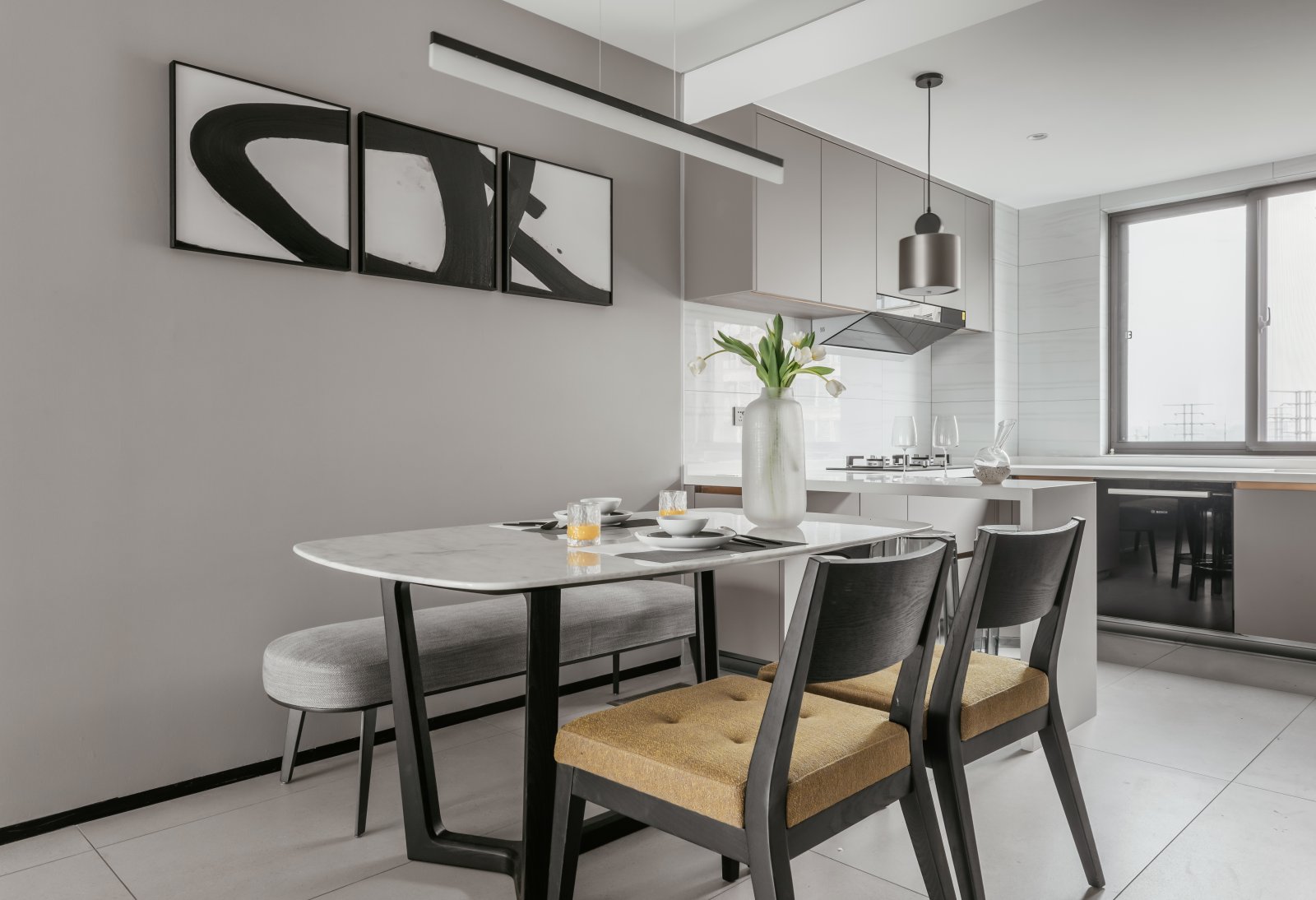 厨房位于餐厅一侧,白色餐桌搭配时尚餐椅,透出休闲的气息,传递出自由的用餐态度。