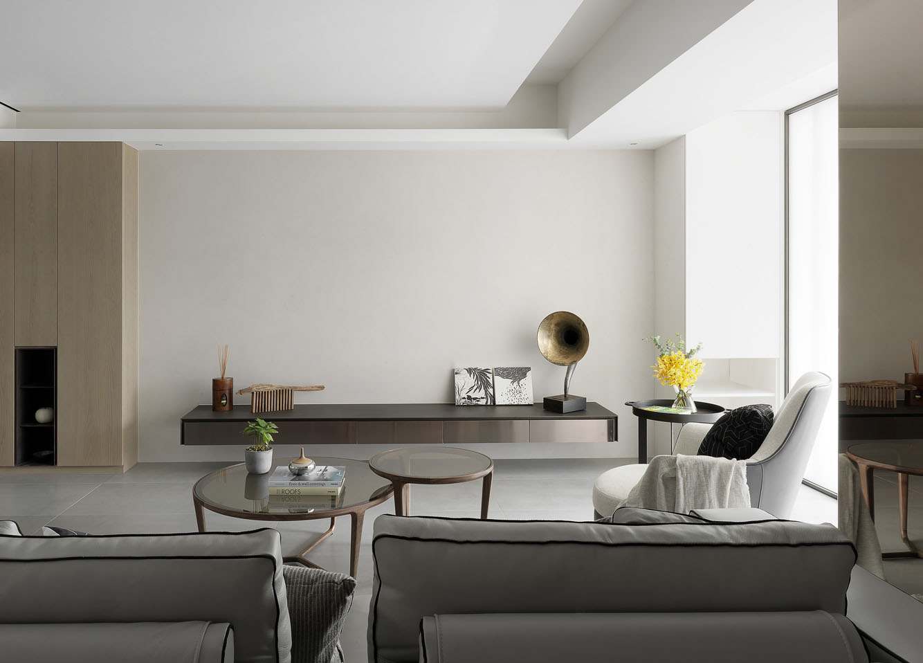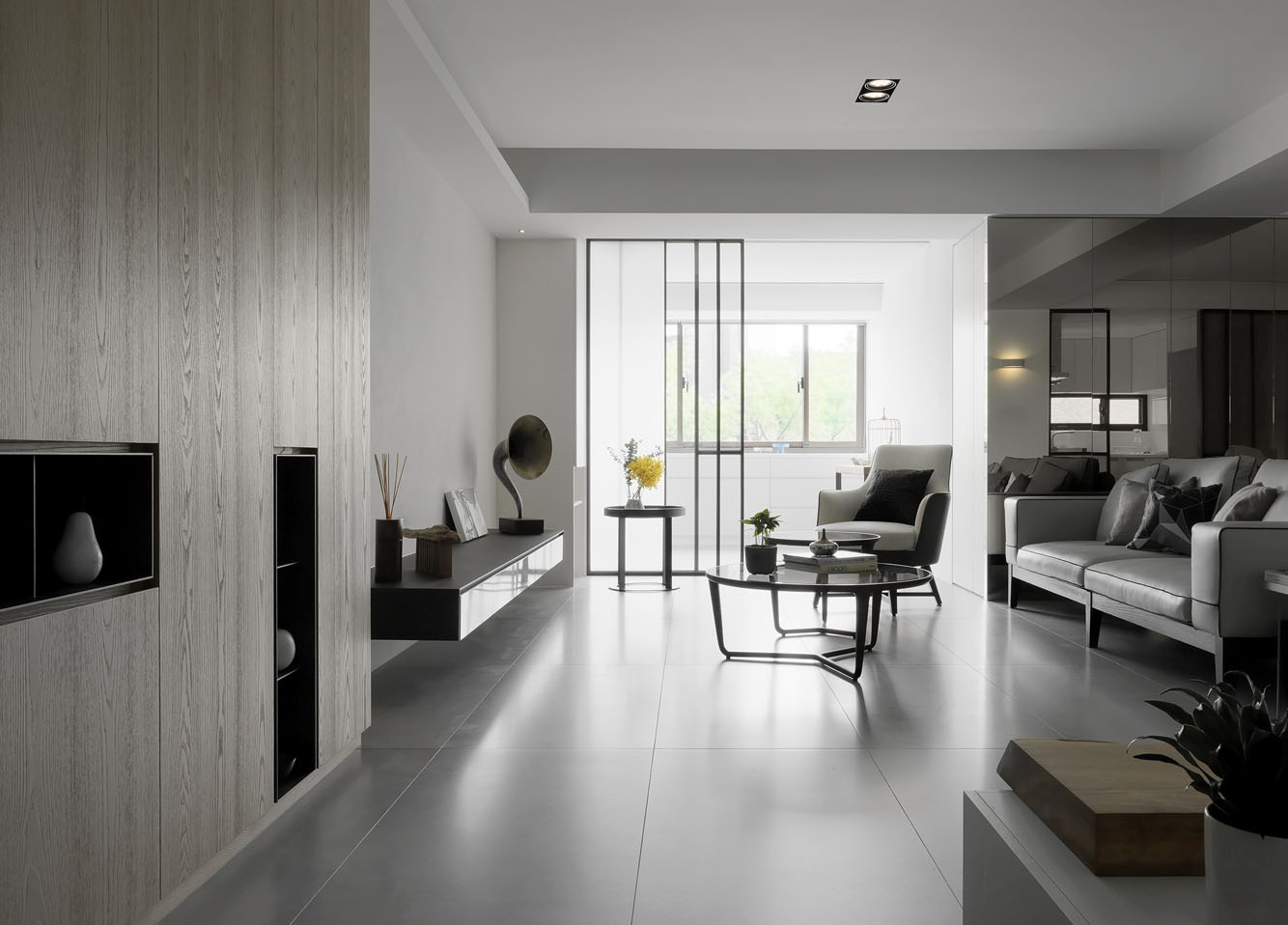 客厅以灰色作为基调,家具简约平静,金属材质的摆件增加了些轻奢质感。