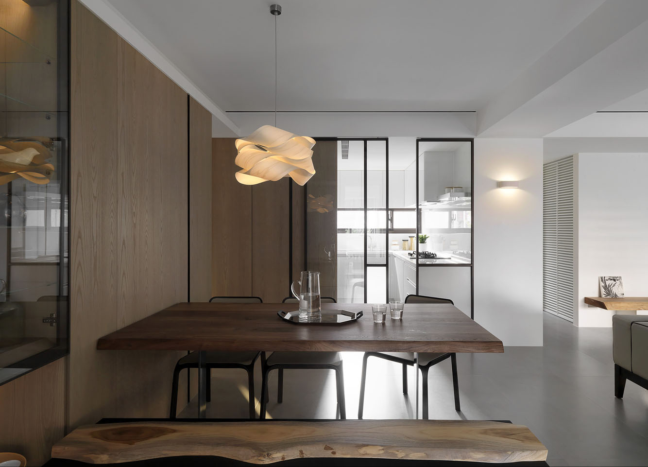 从这个角度可以看到白色厨房的倩影,时尚灯具为餐厅空间增添了一种灵动的韵致。