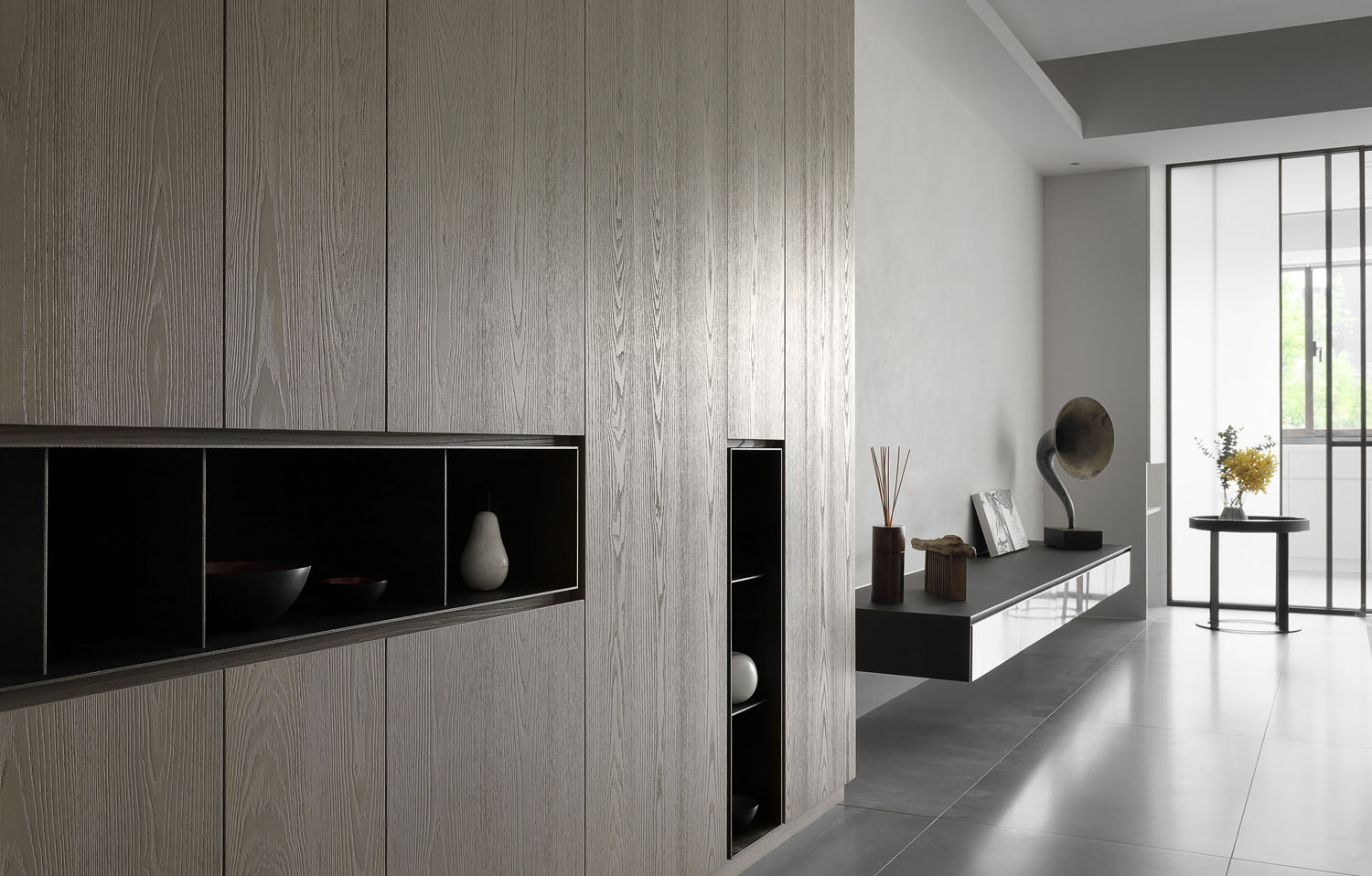 悬空地柜打破了空间的单一性,窗台增加了自然光,摆件安然静置,简洁而意味深远。