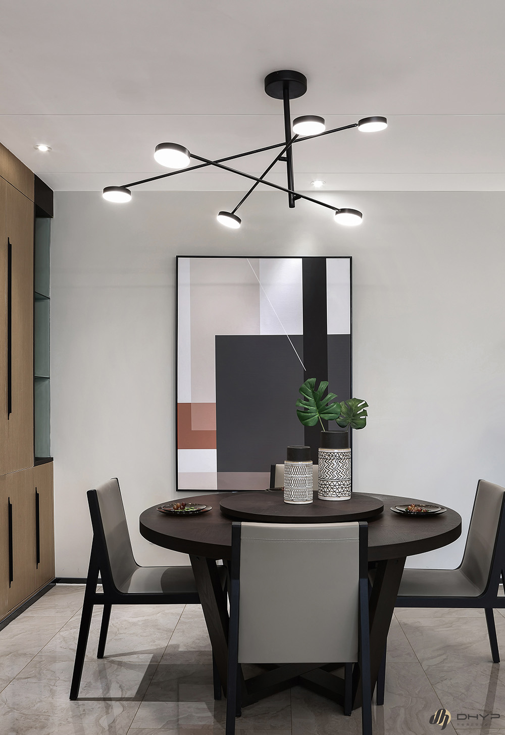 餐厅选用无吊顶设计,灯具与装饰画为空间出入艺术氛围,提升了观赏性。