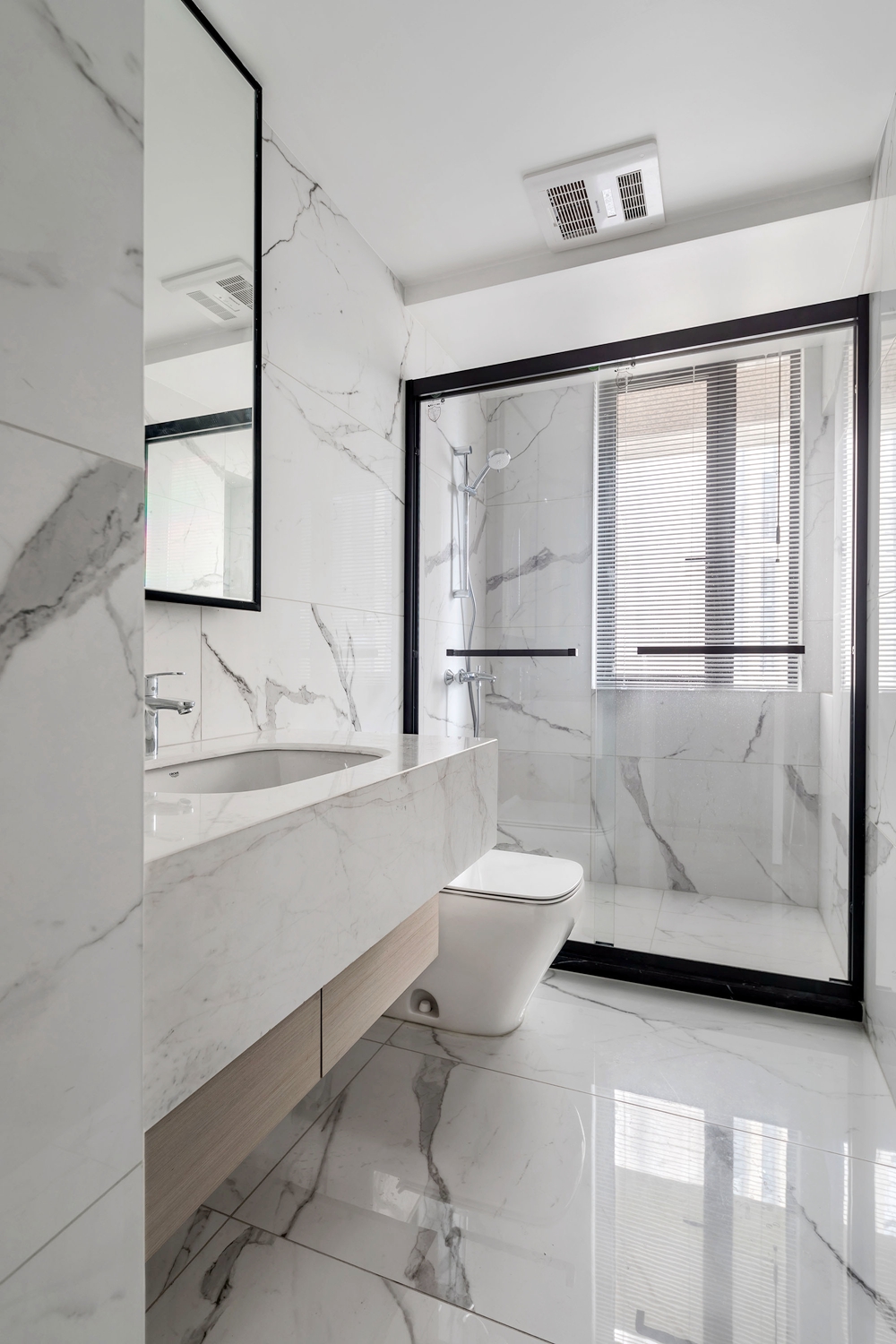 卫浴空间采用白色为主,使用玻璃材质进行干湿分离,令空间不显突兀。