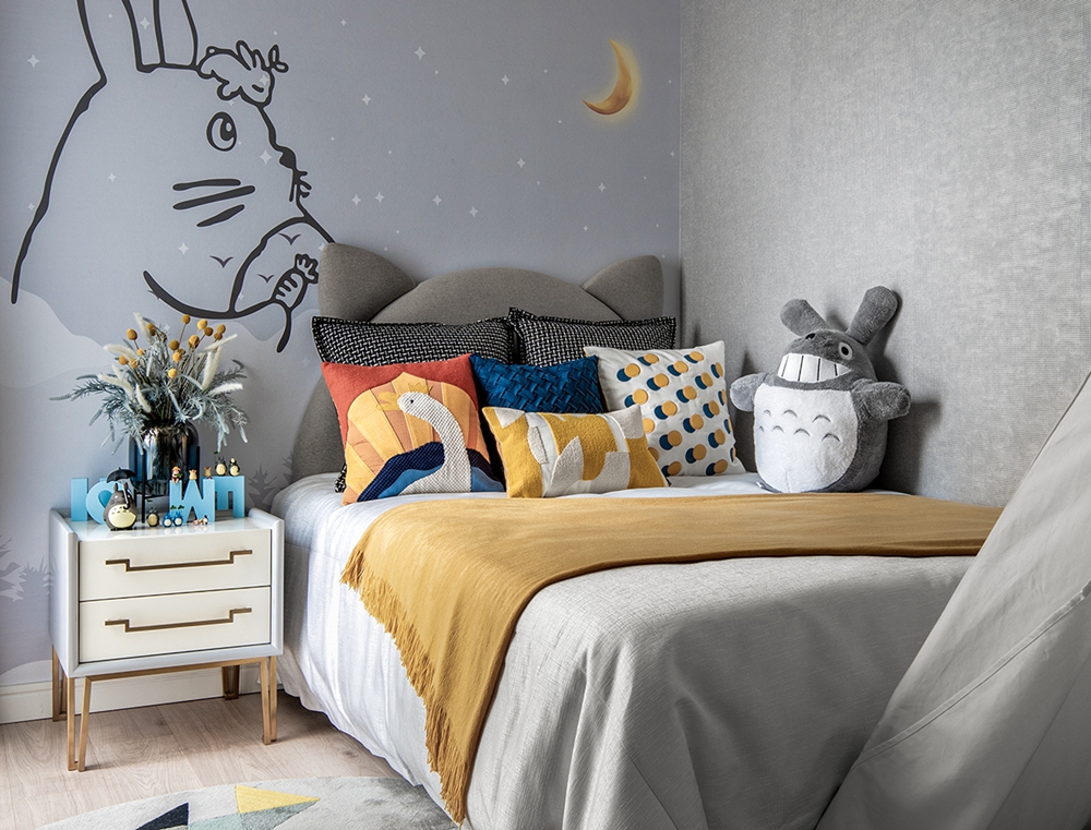 次卧使用龙猫主题进行家装设计,壁纸、软装都贴合空间主题,视觉效果不显突兀。
